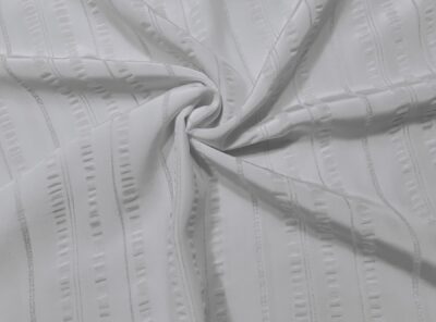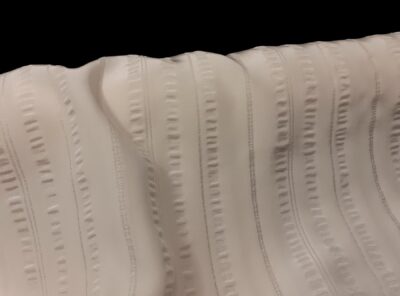 Crepe de Chine bianca in pura seta con effetto riga in georgetteLa Crepe de Chine in pura seta, prodotta a Como, è un tessuto semi-opaco che si ottiene da una trama opaca che contrasta la lucentezza dell’ordito. Caratterizzata da mano leggera e morbida viene utilizzata per realizzare camicie, top, abiti e gonne morbide, pantaloni eleganti, lingerie etc.