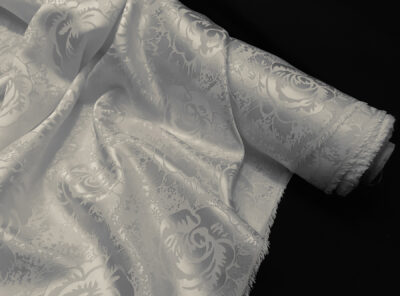 Seta jacquard tinta biancoIn questo tessuto di seta pura, prodotto a Como, la lavorazione jacquard con il contrasto fra lucido e opaco, crea un piacevole effetto di tridimensionalità. Perfetto per la realizzazione di abiti ampi e sinuosi, grazie alla sua morbidezza e caduta, può essere utilizzato anche per capi più lineari che mettono in evidenza la ricchezza e la particolarità di questo tipo di tessuto.
