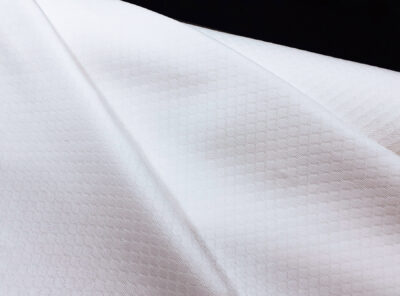 Piquet in cotone biancoQuesto tessuto Piquet con motivi in rilievo a rombi è stato realizzato in puro cotone mercerizzato e ritorto. Di peso sostenuto è indicato nella realizzazione di capi spalla per donna, ma anche per abiti diritti e gonne.