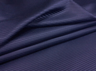 Tessuto in cotone ottoman bluTessuto ottoman in puro cotone piuttosto pesante, caratterizzato da larghe righe orizzontali, piatte e leggermente spaziate tra loro, ben evidenti e marcate. Viene utilizzato per la confezione di capi spalla eleganti o gonne.