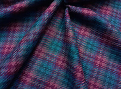 Tessuto in lana merino pied de poule con riquadri turchese e tinta prugnaTessuto a riquadri ad armatura Twill – la più utilizzata per le caratteristiche di robustezza e versatilità – prodotto a Biella in pura lana. Ha peso medio, mano calda e morbida, non si stropiccia e non si usura nel tempo. Consigliato per la realizzazione di capi spalla femminili,abiti e gonne.