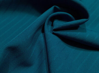 turchese con righe in lucidoIn questo tessuto di pura lana pettinata prodotto a Biella, la lavorazione jacquard con il contrasto fra lucido e opaco, crea un piacevole effetto di tridimensionalità. Di peso medio ha mano calda e compatta ed è adatto per realizzare capispalla, pantaloni e gonne.