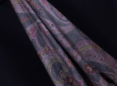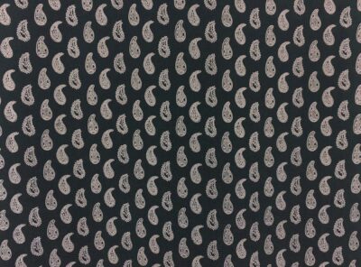 Crepe de Chine in seta fantasia cashmere su fondo neroLa Crepe de Chine in pura seta, prodotta a Como, è un tessuto semi-opaco che si ottiene da una trama opaca che contrasta la lucentezza dell’ordito. Caratterizzata da mano leggera e morbida viene utilizzata per realizzare camicie, top, abiti e gonne morbide, pantaloni eleganti, lingerie etc.