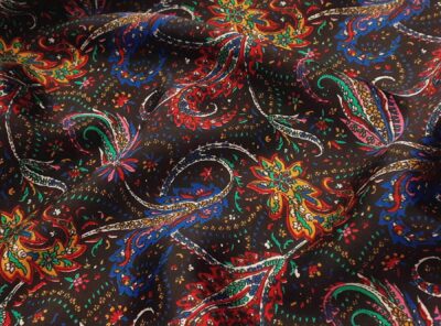 Raso di seta fantasia cashmere fondo neroIl raso di seta pura è caratterizzato da una mano morbida, una lucentezza elegante e una buona caduta. Perfetto per la realizzazione di abiti, camicie, top e foulard.