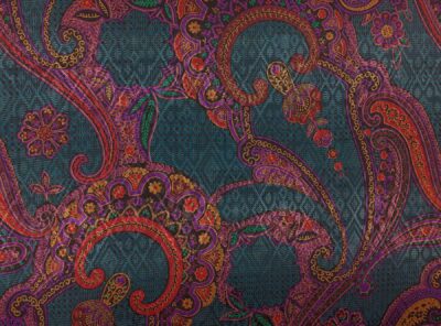 Seta jacquard fantasia cashmere bordeaux su fondo verde ottanioIn questo tessuto di seta pura, prodotto a Como, la lavorazione jacquard con il contrasto fra lucido e opaco, crea un piacevole effetto di tridimensionalità. Perfetto per la realizzazione di abiti ampi e sinuosi, grazie alla sua morbidezza e caduta, può essere utilizzato anche per capi più lineari che mettono in evidenza la ricchezza e la particolarità di questo tipo di tessuto.