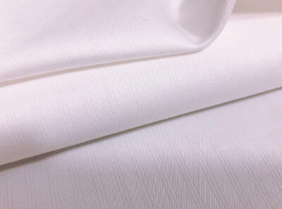 Gabardine in cotone bianco con riga lucidaRealizzato con un filato di cotone pettinato e doppio ritorto di medio peso, questo tessuto -con riga jacquard lucida-ha mano asciutta, compatta e resistente. Viene utilizzato per la realizzazione di giacche e vestiti da uomo ma anche abiti femminili dalle linee pulite e semplici, gonne diritte e capi spalla.