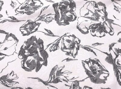Matelassè in cotone fantasia floreale sul grigio fondo avorioQuesto tessuto matelassé in cotone è il risultato di un particolare utilizzo del telaio Jacquard in cui il disegno è costruito a rilievo con un effetto tridimensionale. Per le sue caratteristiche di peso e corposità viene utilizzato per capi spalla e abiti lineari