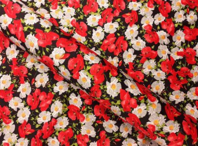 Raso in cotone elasticizzato fantasia floreale fondo neroQuesto tessuto in raso di cotone di peso medio alto è caratterizzato da una mano morbida, una lucentezza elegante e una buona caduta. Perfetto per la realizzazione di abiti diritti ma anche capi spalla.
