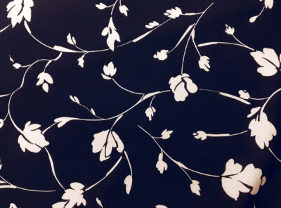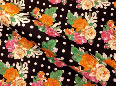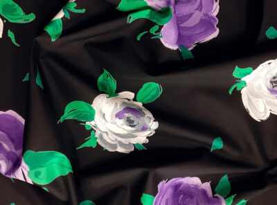 Raso in cotone fantasia floreale fondo neroQuesto tessuto in raso di cotone piuttosto pesante è caratterizzato da una mano morbida e lucentezza elegante. Perfetto per la realizzazione di abiti diritti e capi spalla.