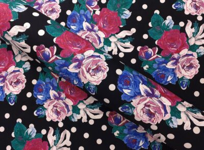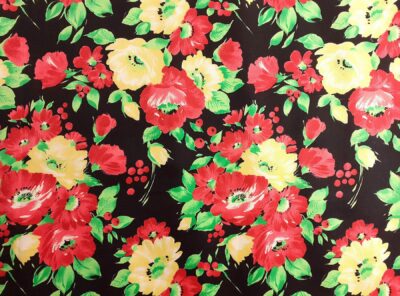 Tela in cotone fantasia floreale su fondo neroTessuto per abiti, gonne morbide e camicie di peso medioleggero in puro cotone mercerizzato e ritorto. Ha mano morbida e aspetto lucente che si ottiene con la classica armatura a tela dove ogni filo di ordito si intreccia con ogni filo di trama.