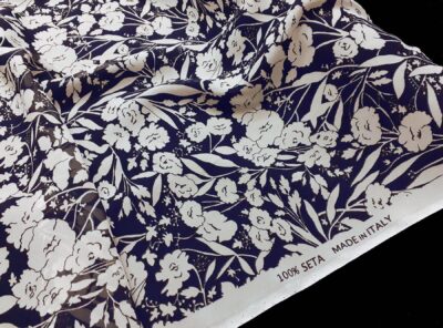 Georgette in seta fantasia floreale bianca su fondo bluLa georgette in seta pura, prodotta a Como, è un tessuto leggero, semi-trasparente, con superficie crespa. La georgette ha un bellissimo drappeggio ed è utilizzabile per la realizzazione di abiti anche a più strati, sovrapposizioni, camicie ed accessori come sciarpe e stole.