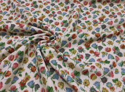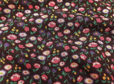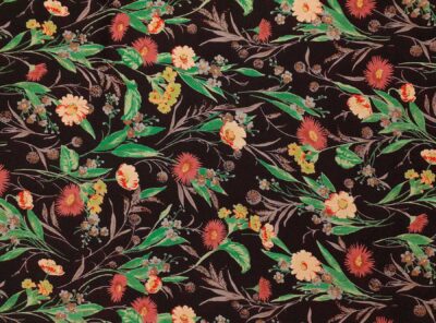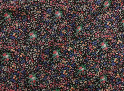 Tessuto in viscosa fantasia floreale fondo neroRealizzato con un filato di viscosa e cotone di medio peso,questo tessuto gabardine ha mano molto morbida, compatta e resistente. Viene utilizzato per la realizzazione di abiti, gonne e blouse.