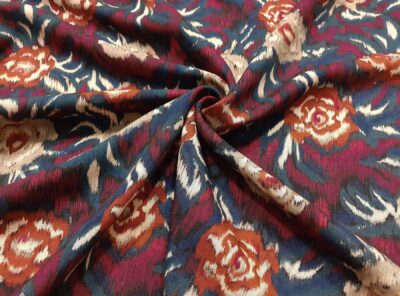 Tessuto in georgette di viscosa fantasia florealeLa georgette in viscosa, è un tessuto leggero, semi-trasparente, con superficie crespa. La georgette ha un bellissimo drappeggio ed è utilizzabile per la realizzazione di abiti anche a più strati e camicie. Si consiglia di bagnare il tessuto prima della confezione in quanto si restringe in modo sensibile.