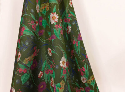 Tessuto in viscosa fantasia floreale fondo verde scuroRealizzato con un filato di viscosa e cotone di medio peso,questo tessuto gabardine ha mano molto morbida, compatta e resistente. Viene utilizzato per la realizzazione di abiti, gonne e blouse.