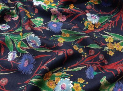 Mussola di lana fantasia floreale su fondo neroLa mussola di lana è un tessuto caldo, leggero e morbido. Viene utilizzata per confezionare camicie, abiti e gonne morbide.