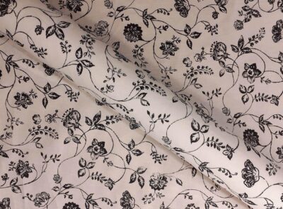Popeline in cotone satinato fantasia floreale in bianco e neroQuesto tessuto in puro cotone egiziano doppio ritorto, è un tessuto liscio, compatto e allo stesso tempo morbido e setoso al tatto. Si contraddistingue per una notevole lucentezza, una resistenza all’usura, al tempo e ai lavaggi. È perfetto per confezionare abiti e blouse ma può essere usato anche per capispalla.