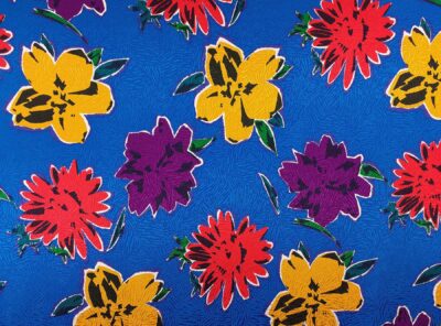 Seta Shantung fantasia floreale su fondo celesteQuesto tessuto di seta, prodotto a Como, è stato realizzato utilizzando filati shantung molto ritorti e quindi poco irregolari. Si presenta compatto, poco rilevato, ma conserva le caratteristiche dello shantung ovvero la mano sostenuta e “croccante”. Ha un aspetto semi opaco conferito dall’ordito opaco e dalla trama lucida inoltre è un tessuto che non si stropiccia ed è resistente all’usura.
