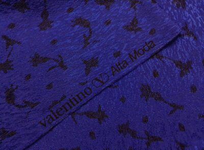 Seta jacquard fiori neri stilizzati su fondo blu egiziano. Valentino Alta ModaIn questo tessuto di seta pura, prodotto a Como, la lavorazione jacquard con il contrasto fra lucido e opaco, crea un piacevole effetto di tridimensionalità. Perfetto per la realizzazione di abiti ampi e sinuosi, grazie alla sua morbidezza e caduta, può essere utilizzato anche per capi più lineari che mettono in evidenza la ricchezza e la particolarità di questo tipo di tessuto.