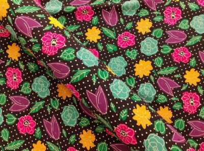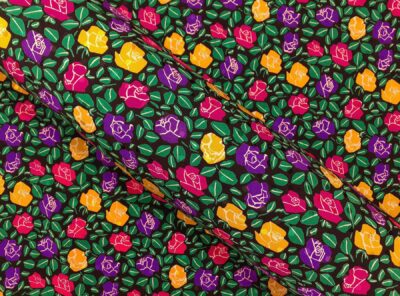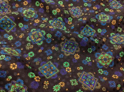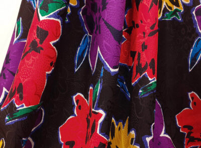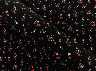 Crepe de Chine in seta fiorellini su fondo neroLa Crepe de Chine in pura seta, prodotta a Como, è un tessuto semi-opaco che si ottiene da una trama opaca che contrasta la lucentezza dell’ordito. Caratterizzata da mano leggera e morbida viene utilizzata per realizzare camicie, top, abiti e gonne morbide, pantaloni eleganti, lingerie etc.