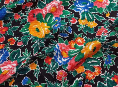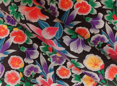 Seta 4 capi graffata fantasia floreale su fondo neroTessuto in pura seta le cui pieghe irregolari – realizzate con una particolare tessitura – gli conferiscono un aspetto goffrato. Inoltre grazie alla sua superficie mossa e “rugosa” ha il grande vantaggio di non sgualcirsi.