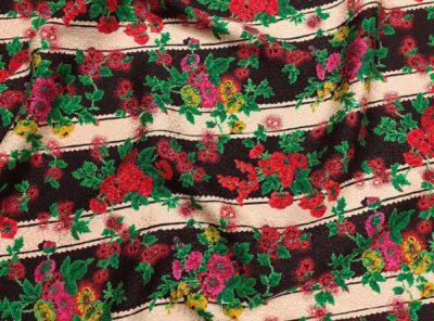 Seta jacquard fantasia floreale e righe su fondo neroIn questo tessuto di seta pura, prodotto a Como, la lavorazione jacquard con il contrasto fra lucido e opaco, crea un piacevole effetto di tridimensionalità. Perfetto per la realizzazione di abiti ampi e sinuosi, grazie alla sua morbidezza e caduta, può essere utilizzato anche per capi più lineari che mettono in evidenza la ricchezza e la particolarità di questo tipo di tessuto.