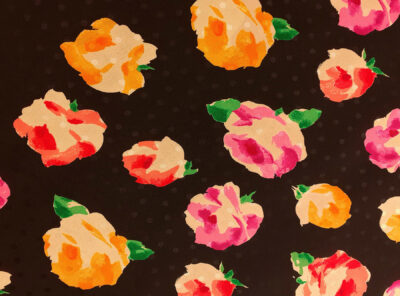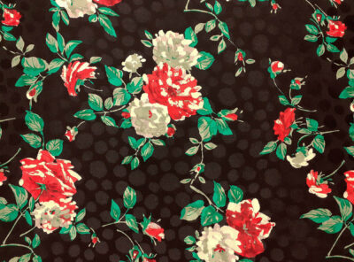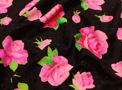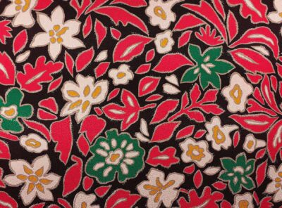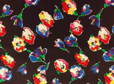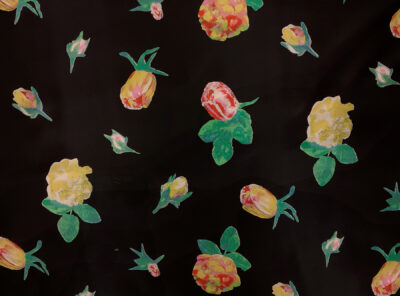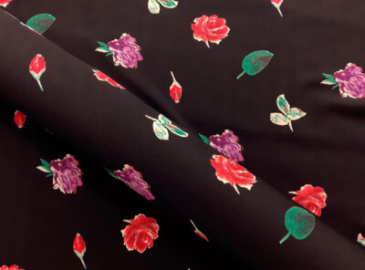 Crepe de Chine in seta fantasia floreale su fondo neroLa Crepe de Chine in pura seta, prodotta a Como, è un tessuto semi-opaco che si ottiene da una trama opaca che contrasta la lucentezza dell’ordito. Caratterizzata da mano leggera e morbida viene utilizzata per realizzare camicie, top, abiti e gonne morbide, pantaloni eleganti, lingerie etc.