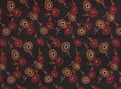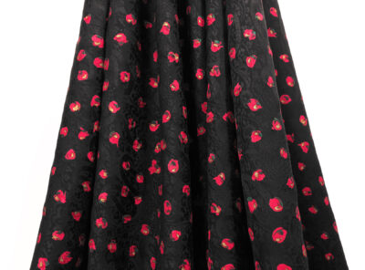 Seta jacquard piccoli fiori rossi stilizzati su fondo neroIn questo tessuto di seta pura, prodotto a Como, la lavorazione jacquard con il contrasto fra lucido e opaco, crea un piacevole effetto di tridimensionalità. Perfetto per la realizzazione di abiti ampi e sinuosi, grazie alla sua morbidezza e caduta, può essere utilizzato anche per capi più lineari che mettono in evidenza la ricchezza e la particolarità di questo tipo di tessuto.