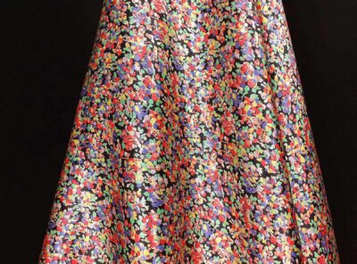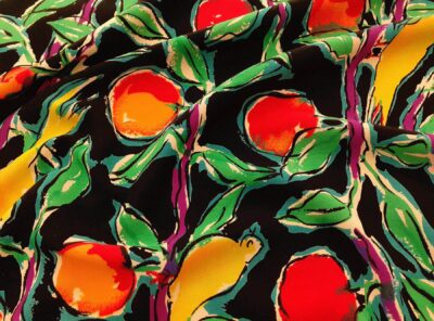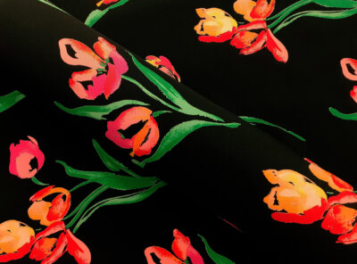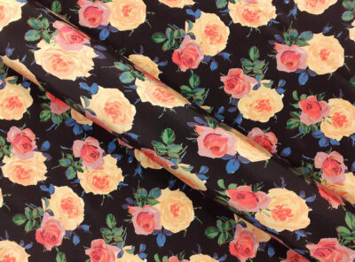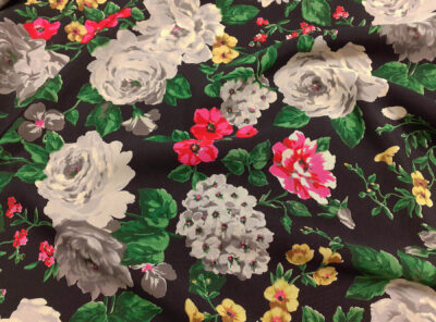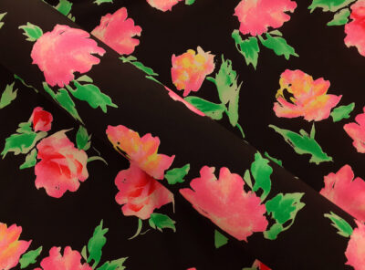 Crepe de Chine in seta fantasia floreale su fondo neroLa Crepe de Chine in pura seta, prodotta a Como, è un tessuto semi-opaco che si ottiene da una trama opaca che contrasta la lucentezza dell’ordito. Caratterizzata da mano leggera e morbida viene utilizzata per realizzare camicie, top, abiti e gonne morbide, pantaloni eleganti, lingerie etc.