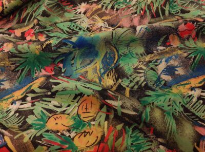 Twill in seta fantasia giungla su fondo neroIl twill in seta, caratterizzato da una leggera trama in diagonale, è resistente e non trasparente, perfetto per bluse a manica ampia oppure per gonne più voluminose e meno fluide.