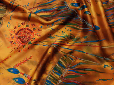 raso di seta fantasia astratta fondo oroIl raso di seta pura è caratterizzato da una mano morbida, una lucentezza elegante e una buona caduta. Perfetto per la realizzazione di abiti, camicie, top e foulard.