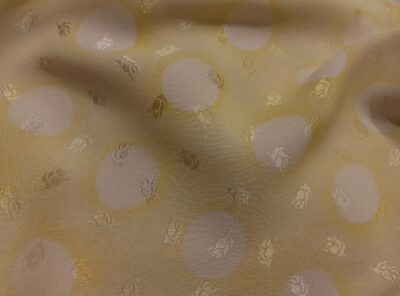 Seta jacquard pois avorio su fondo giallo pallidoIn questo tessuto di seta pura, prodotto a Como, la lavorazione jacquard con il contrasto fra lucido e opaco, crea un piacevole effetto di tridimensionalità. Perfetto per la realizzazione di abiti ampi e sinuosi, grazie alla sua morbidezza e caduta, può essere utilizzato anche per capi più lineari che mettono in evidenza la ricchezza e la particolarità di questo tipo di tessuto.