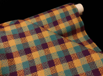 Tessuto jacquard in lana a riquadri tinta ocra, bordeaux e turcheseIn questo tessuto di pura lana pettinata prodotto a Biella la lavorazione jacquard, con il contrasto fra lucido e opaco, crea un piacevole effetto di tridimensionalità. Di peso medio ha mano calda e compatta ed è adatto per realizzare capi spalla,abiti e gonne.