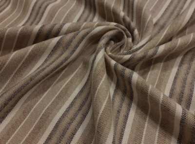 Mussola di lana a righe beige e marrone su fondo avorioQuesta mussola di lana e alpaca prodotta a Biella, di peso medio-leggero, è un tessuto molto caldo, leggero e morbido. Viene utilizzata per confezionare camicie, abiti e gonne morbide.