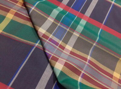 Raso di cotone fondo blu fantasia madras multicoloreQuesto tessuto madras in raso di cotone di peso medio è caratterizzato da una mano morbida, una lucentezza elegante e una buona caduta. Perfetto per la realizzazione di abiti, gonne ampie, camicie e top. Prodotto della tessitura Solbiati