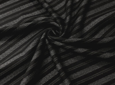 Mussola di lana a righe assimetriche avorio su fondo neroLa mussola di lana è un tessuto caldo, leggero e morbido. Viene utilizzata per confezionare camicie, abiti e gonne morbide.