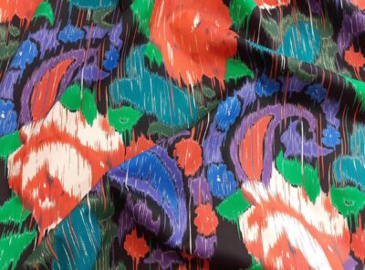 Popeline in cotone satinato fantasia astratta fondo neroQuesto tessuto in puro cotone egiziano doppio ritorto, è un tessuto liscio, compatto e allo stesso tempo morbido e setoso al tatto. Si contraddistingue per una notevole lucentezza, una resistenza all’usura, al tempo e ai lavaggi. È perfetto per confezionare abiti e blouse ma può essere usato anche per capispalla.