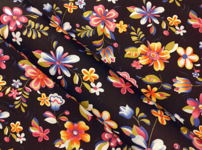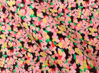 Tessuto in jersy di viscosa fantasia floreale fondo neroTessuto in jersey di viscosa di peso medio leggero con aspetto lucido e cadente, utilizzato per vestiti femminili, camicette e ampie gonne.