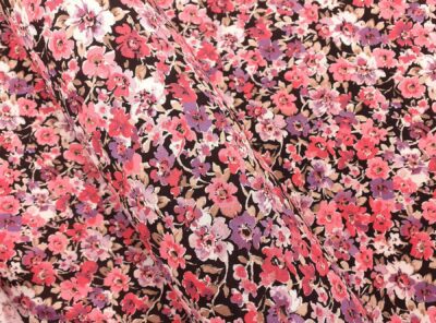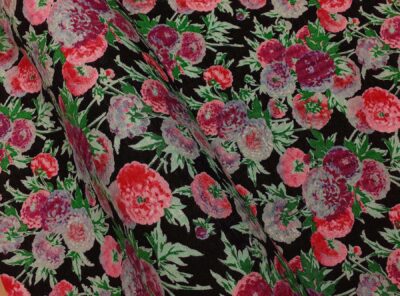 Tessuto in viscosa fantasia floreale rosa fondo neroIl popeline in viscosa è un tessuto leggero, liscio, compatto, molto morbido e setoso al tatto. Si contraddistingue per una notevole resistenza all’usura, al tempo e ai lavaggi. È perfetto per confezionare abiti e camicie.
