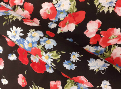 Tessuto in viscosa fantasia floreale fondo neroIl popeline in viscosa è un tessuto leggero, liscio, compatto, molto morbido e setoso al tatto. Si contraddistingue per una notevole resistenza all’usura, al tempo e ai lavaggi. È perfetto per confezionare abiti e camicie.