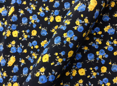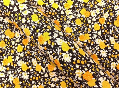 Tessuto in viscosa fantasia floreale gialla fondo neroIl popeline in viscosa è un tessuto leggero, liscio, compatto, molto morbido e setoso al tatto. Si contraddistingue per una notevole resistenza all’usura, al tempo e ai lavaggi. È perfetto per confezionare abiti e camicie.