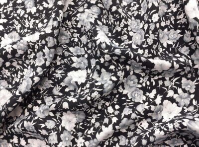 Tessuto in viscosa fantasia floreale bianco e neroIl popeline in viscosa è un tessuto leggero, liscio, compatto, molto morbido e setoso al tatto. Si contraddistingue per una notevole resistenza all’usura, al tempo e ai lavaggi. È perfetto per confezionare abiti e camicie.