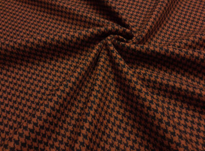 Tessuto in lana merino pied de poule nero e tinta ocra aranciataTessuto pied de poule ad armatura Twill – la più utilizzata per le caratteristiche di robustezza e versatilità – prodotto a Biella in pura lana merino. Ha peso medio-alto, mano calda, non si stropiccia e non si usura nel tempo. Consigliato per la realizzazione di capi spalla femminili, pantaloni, abiti e gonne.