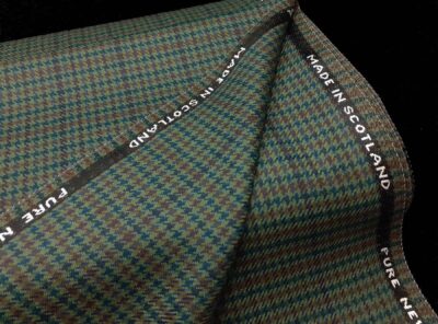 Tessuto prodotto in Scozia in lana merino pied de poule blu e marrone su fondo verdeTessuto ad armatura Twill – la più utilizzata nei tessuti di drapperia per le caratteristiche di robustezza e versatilità – prodotto in Scozia in pura lana merino. Ha peso medio, mano calda e morbida, non si stropiccia e non si usura nel tempo. Consigliato per la realizzazione di giacche uomo ma anche per capi spalla femminil e gonne.