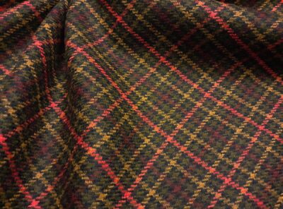 Pied de poule in lana merino finestrato verde oliva, corallo e senapeTessuto pied de poule ad armatura Twill – la più utilizzata per le caratteristiche di robustezza e versatilità – prodotto a Biella in pura lana merino. Ha peso medio, mano calda, non si stropiccia e non si usura nel tempo. Consigliato per la realizzazione di capi spalla femminili e gonne.