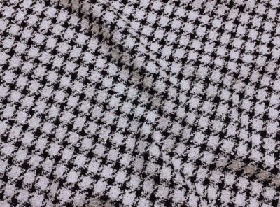 Chanel in cotone morbido bianco pied de poule neroIn questo tessuto Chanel, di peso medio-alto, gli effetti di filatura bouclè sono intrecciati con filati di cotone ritorto. La mano è morbida e corposa, ideale per la realizzazione di abiti e taileur eleganti.