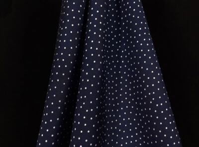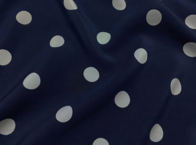 Crepe de Chine in seta fantasia pois avorio su fondo bluLa Crepe de Chine in pura seta, prodotta a Como, è un tessuto semi-opaco che si ottiene da una trama opaca che contrasta la lucentezza dell’ordito. Caratterizzata da mano leggera e morbida viene utilizzata per realizzare camicie, top, abiti e gonne morbide, pantaloni eleganti, lingerie etc.