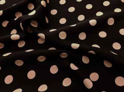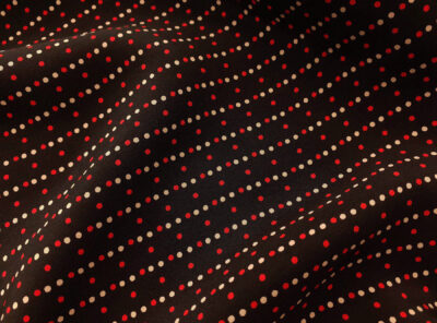 Crepe de Chine in seta fantasia pois rossi e avorio su fondo neroLa Crepe de Chine in pura seta, prodotta a Como, è un tessuto semi-opaco che si ottiene da una trama opaca che contrasta la lucentezza dell’ordito. Caratterizzata da mano leggera e morbida viene utilizzata per realizzare camicie, top, abiti e gonne morbide, pantaloni eleganti, lingerie etc.