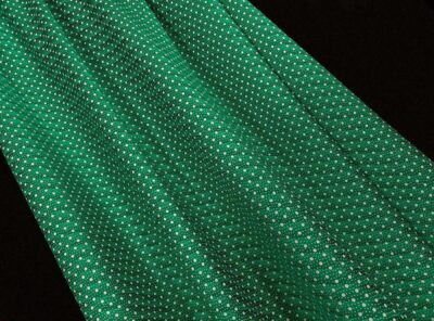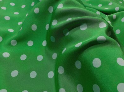 Seta jacquard fantasia piccoli pois bianchi su fondo verde pratoIn questo tessuto di seta pura, prodotto a Como, la lavorazione jacquard con il contrasto fra lucido e opaco, crea un piacevole effetto di tridimensionalità. Perfetto per la realizzazione di abiti ampi e sinuosi, grazie alla sua morbidezza e caduta, può essere utilizzato anche per capi più lineari che mettono in evidenza la ricchezza e la particolarità di questo tipo di tessuto.