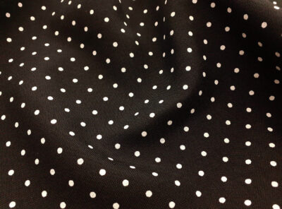 Crepe Marocaine in seta pois nero su fondo biancoLa Crepe Marocaine in pura seta è un tessuto lucido al rovescio e semi- lucido al diritto, decisamente piu pesante della crepe de chine. Caratterizzato da mano morbida ed eccellente caduta, viene utilizzato per realizzare gonne e abiti diritti ma fluidi, tailleur, pantaloni eleganti, etc.