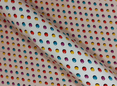 Crepe de Chine in seta pois colorati su fondo biancoLa Crepe de Chine in pura seta, prodotta a Como, è un tessuto semi-opaco che si ottiene da una trama opaca che contrasta la lucentezza dell’ordito. Caratterizzata da mano leggera e morbida viene utilizzata per realizzare camicie, top, abiti e gonne morbide, pantaloni eleganti, lingerie etc.